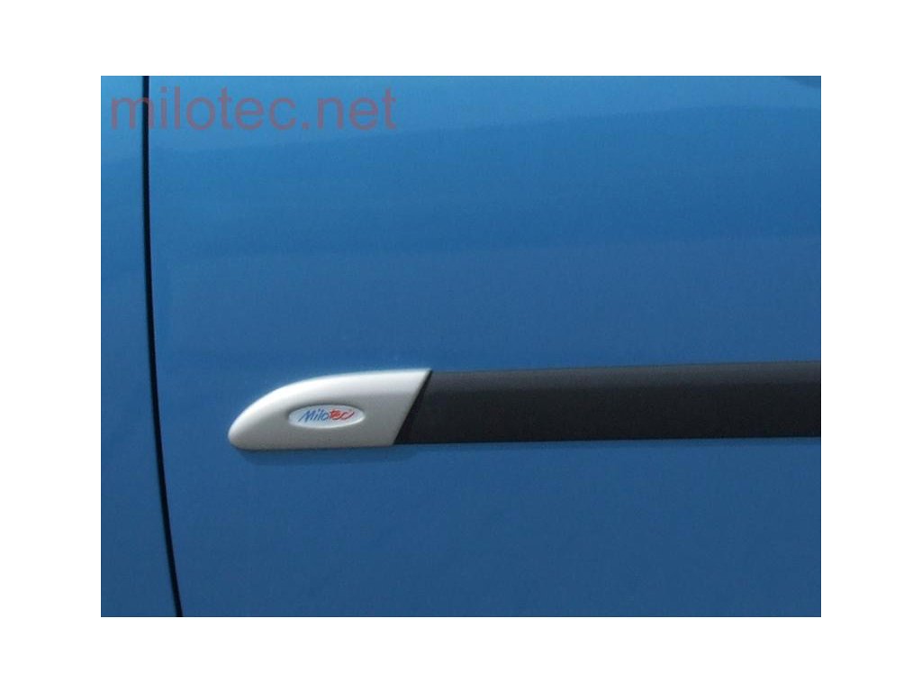 1 pár krytů originálních bočních ochranných lišt ze stříbrného matného ABS s nalepeným znakem Milotec