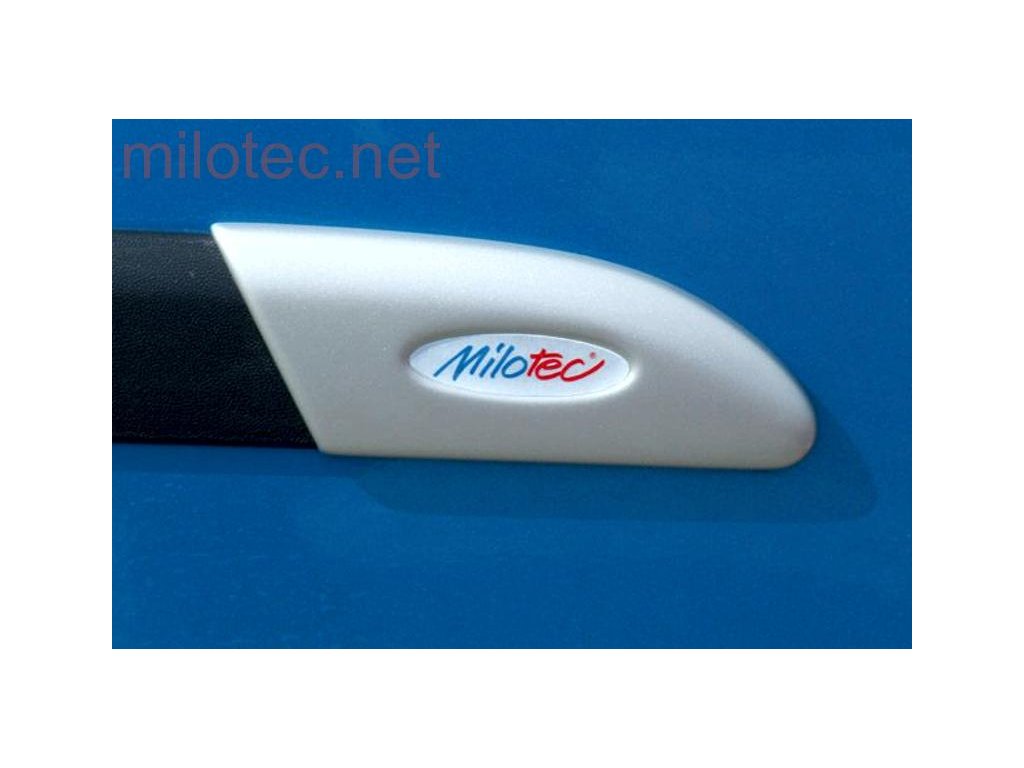 1 pár krytů originálních bočních ochranných lišt ze stříbrného matného ABS s nalepeným znakem Milotec